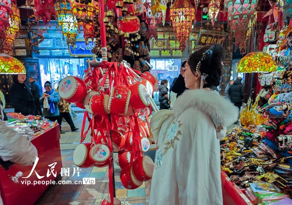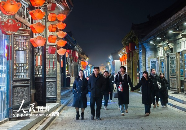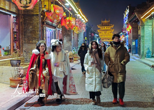 元旦假期,平遥古城“夜经济”持续升温。游客们漫步古街,观夜景、品美食、购文创、穿古装打卡,呈现出夜游、夜娱、夜食、夜购、夜赏融合发展的多元消费新图景。梁生仁摄(人民图片网)