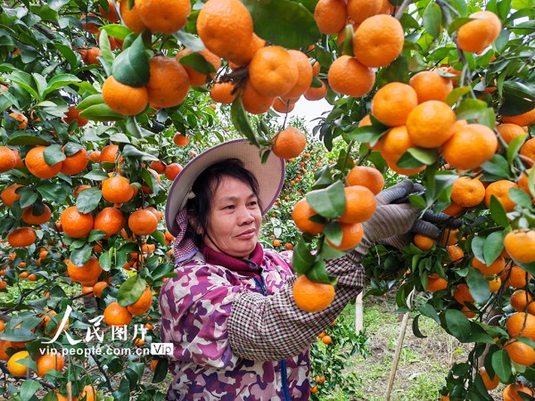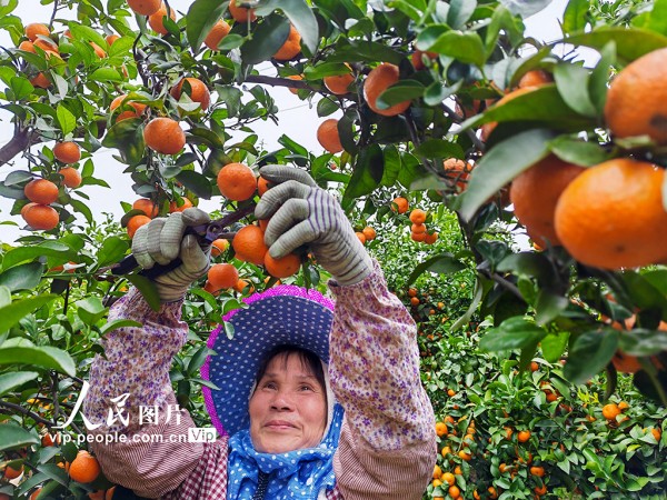 眼下,广西金秀瑶族自治县的沙糖桔陆续成熟,果农们正忙着采摘、分拣、搬运、装车外销,田间地头一派繁忙的丰收景象。高如金摄(人民图片网)