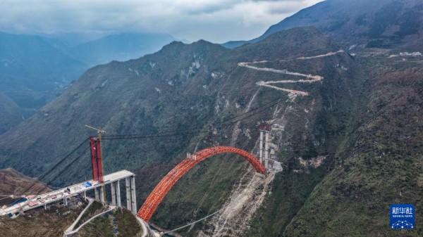1月5日,随着最后一节钢拱精准吊装到位,贵州交投集团承建的安顺至盘州高速公路古牛河特大桥顺利合龙,为后续工程建设推进奠定了坚实基础。古牛河特大桥是安盘高速控制性工程,全长881.8米,主桥横跨古牛河,主桥桥面到谷底高度约400米。