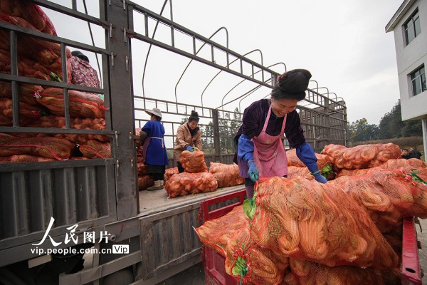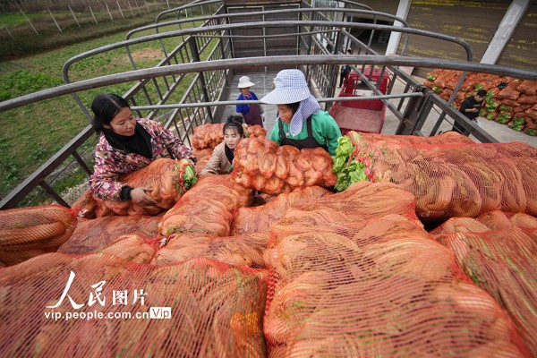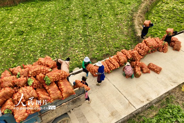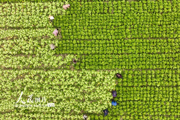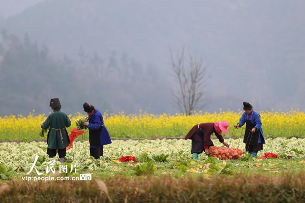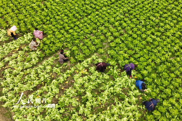 2026年1月12日,贵州省黔东南苗族侗族自治州丹寨县兴仁镇甲脚村芥菜种植基地,村民正在采收芥菜。杨武魁摄(人民图片网)