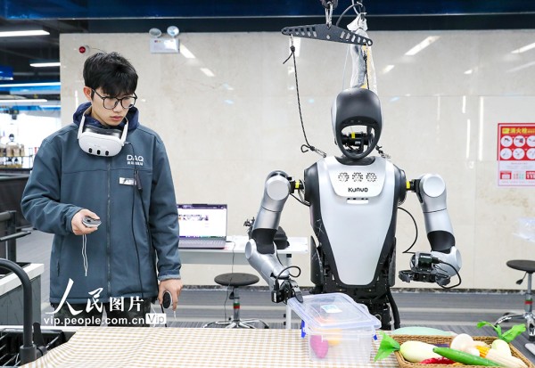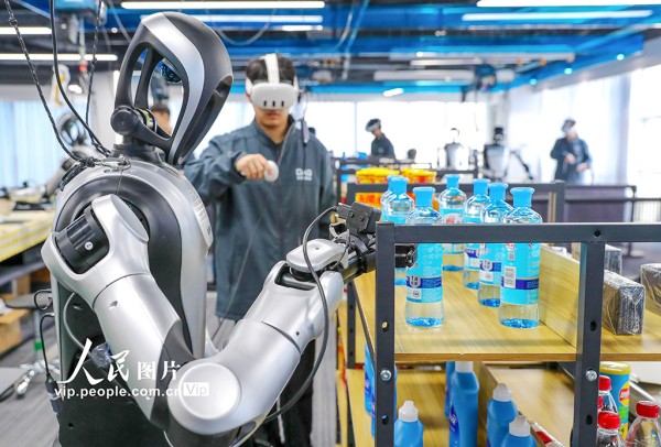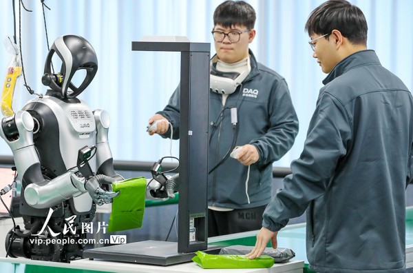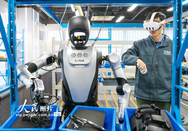 2026年1月12日,在山东青岛人形机器人数据采集训练场内,数据采集员头戴VR设备、手持感应手柄,指导人形机器人进行抓取、搬运、分拣等精细化操作训练。