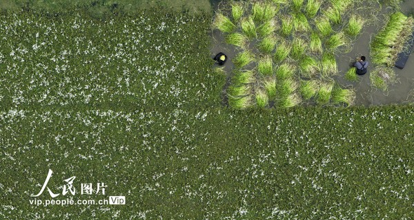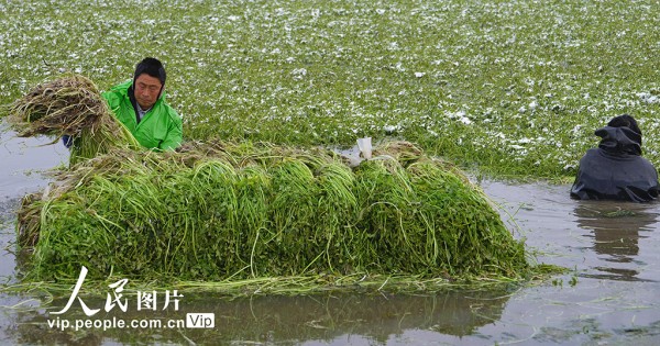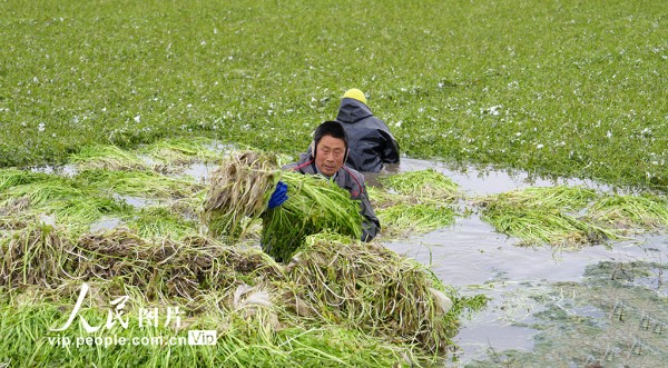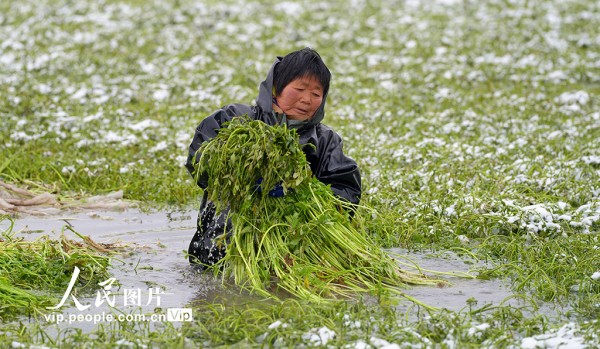 2026年1月20日,江苏海安墩头镇长垎村水芹种植基地,菜农正冒着严寒在水田采收水芹,准备供应市场。周强摄(人民图片网)