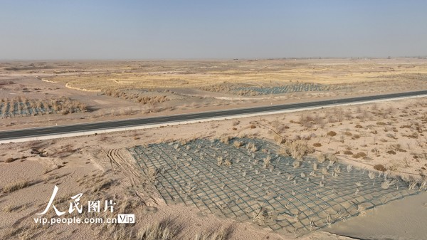 2026年1月22日,在甘肃酒泉金塔至大墩门公路两侧的沙丘带上,一道道由阻沙网与草方格构成的“沙海防线”,牢牢锁住了随风移动的沙丘。