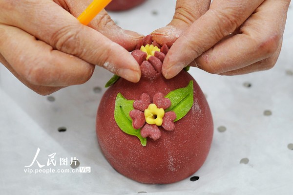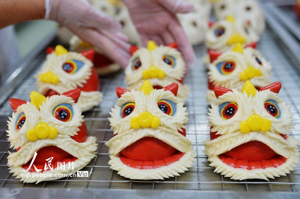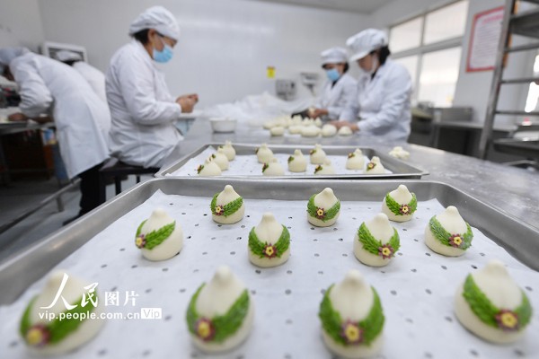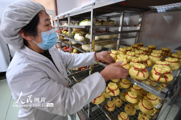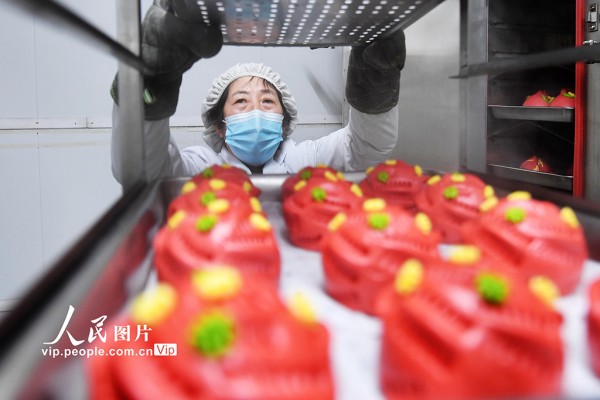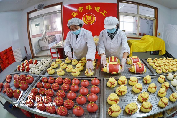 春节临近,位于山东青岛城阳区上马街道的非遗花饽饽迎来销售旺季,工人正加紧生产,供应节前市场。王海滨摄(人民图片网)