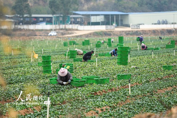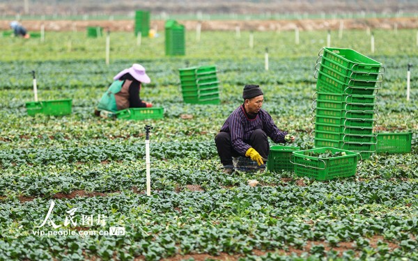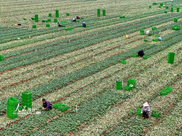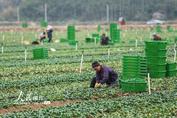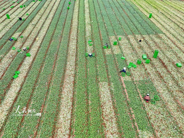 2026年1月24日,广西贺州平桂区黄田镇长龙村供港蔬菜基地,工人正忙着采收上海青,供应粤港澳大湾区市场。黎豪图摄(人民图片网)