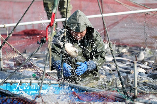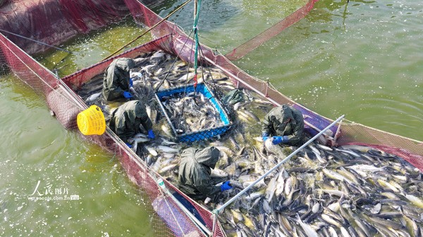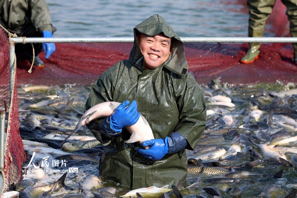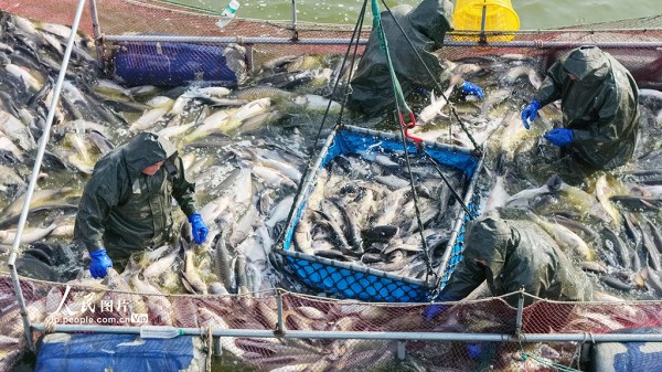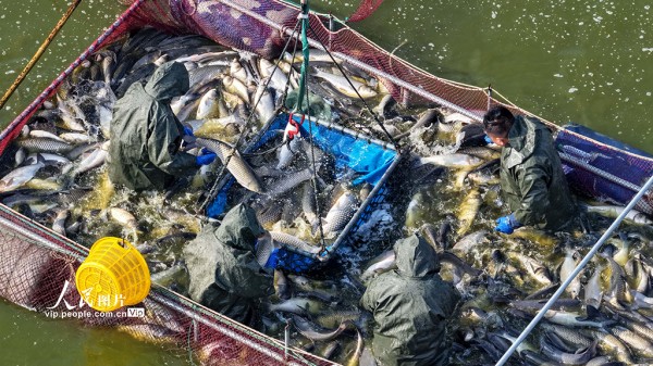 2026年1月27日,江苏淮安洪泽区岔河镇淡水鱼养殖基地,养殖户正组织工人捕鱼、分装,现场一派繁忙。殷潮摄(人民图片网)
