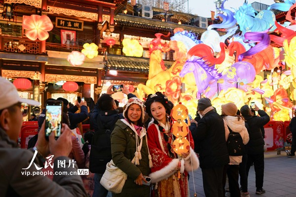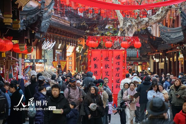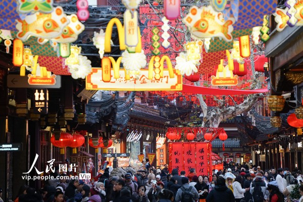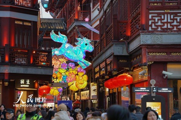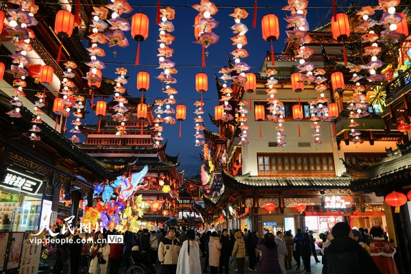 2026年1月27日,上海豫园农历马年灯会流光溢彩,黄金广场、中心广场、九曲桥畔华灯璀璨,吸引众多游客前来观赏打卡。王冈摄(人民图片网)
