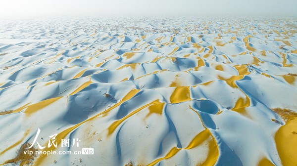 2026年1月29日,新疆巴音郭楞蒙古自治州尉犁县塔克拉玛干沙漠边缘迎来降雪。皑皑白雪覆盖下的沙海,静谧而壮美。汪志鹏摄(人民图片网)