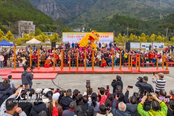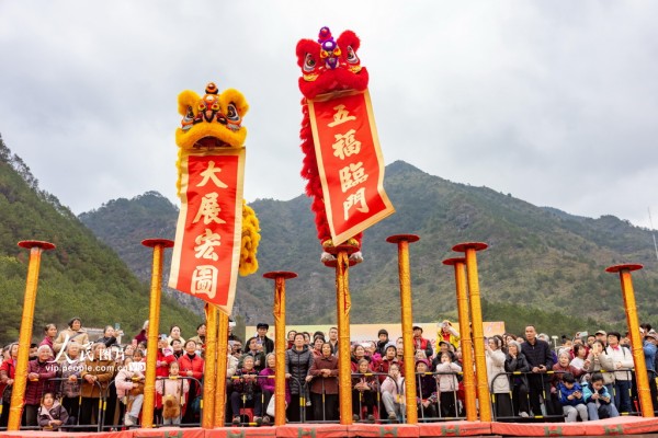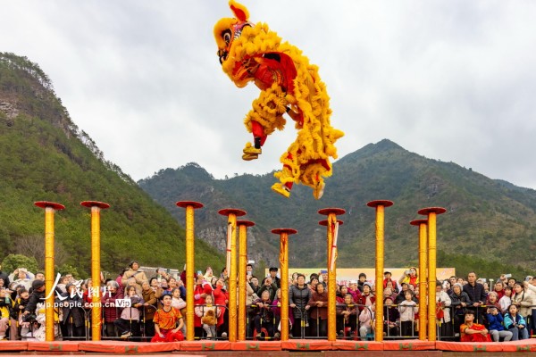 2026年2月7日,在广西梧州市蒙山县天书侠谷景区,来自藤县禤洲的舞狮队表演国家级非物质文化遗产高桩狮舞,用一套高难度、惊险刺激的动作为群众奉上一场视觉盛宴。黄胜林摄(人民图片网)