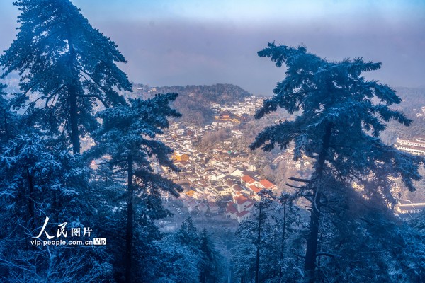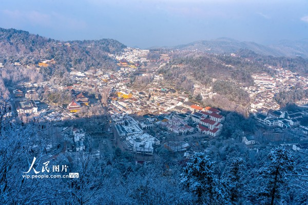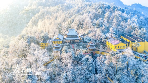 2026年2月8日,安徽池州九华山风景区银装素裹,玉树琼枝与古寺雪峰相映,如诗如画。胡莹莹摄(人民图片网)