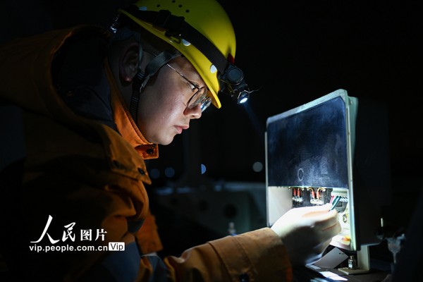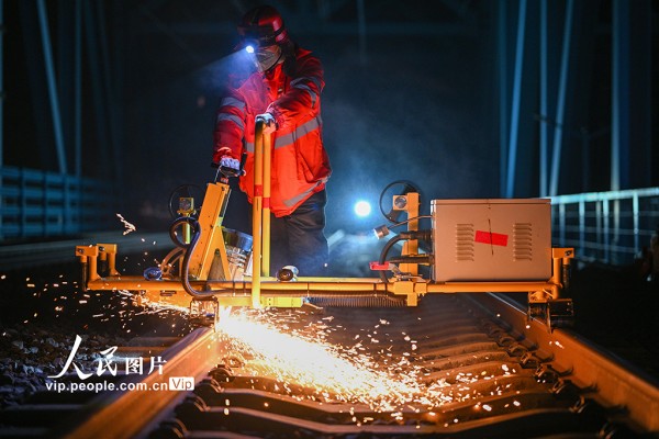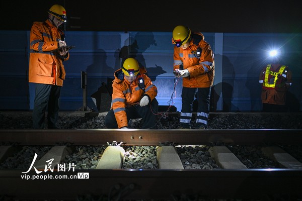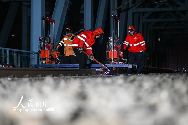 2026年2月11日凌晨,中国铁路上海局集团有限公司南京桥工段、南京电务段组成工电联合作业组,在南京大胜关长江大桥上对京沪高铁设备进行重点检查、养护和测试,保障春运期间铁路运行安全稳定。方东旭摄(人民图片网)