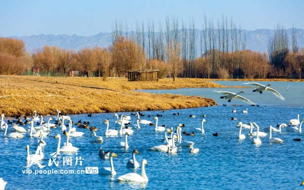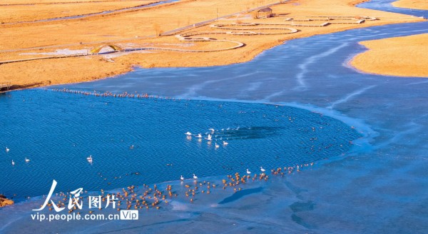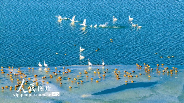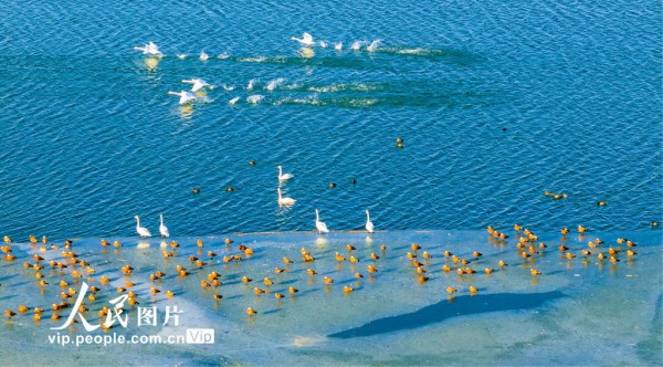 2026年2月24日,甘肃张掖国家湿地公园冰雪逐渐消融,成群的大天鹅、赤麻鸭等候鸟在湖水中游弋、觅食。杨永伟摄(人民图片网)