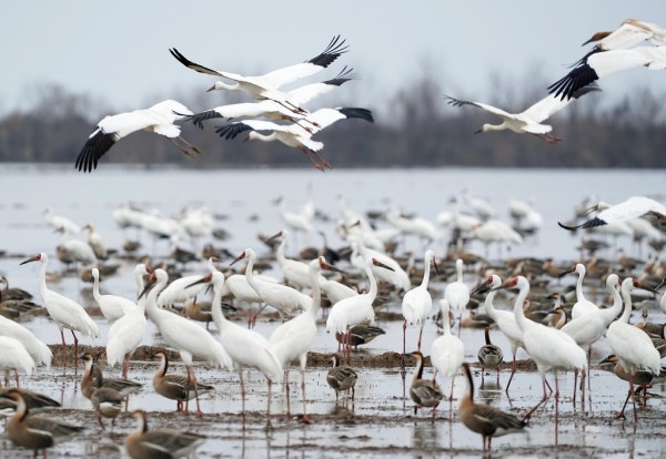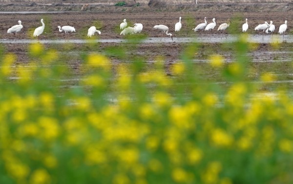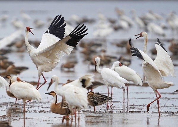 这是2月27日在江西上饶市余干县白鹤洲拍摄的白鹤等候鸟。初春时节,上千只白鹤齐聚鄱阳湖畔的江西省上饶市余干县白鹤洲栖息觅食。它们时而凌空飞舞,时而滩涂嬉戏,构成一幅生机盎然的生态画卷。新华社记者 万象 摄