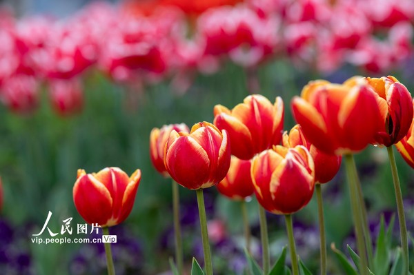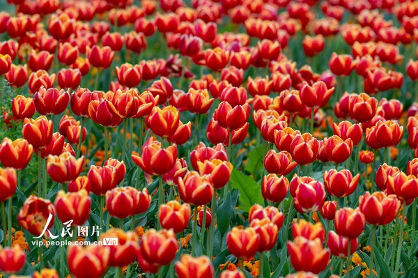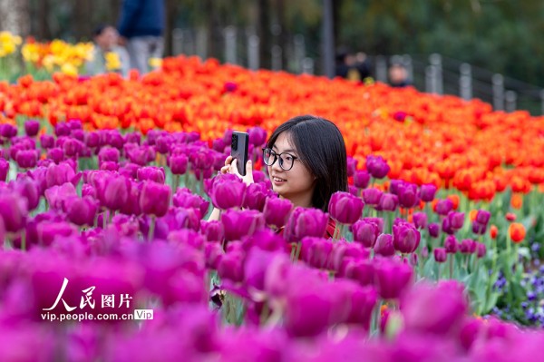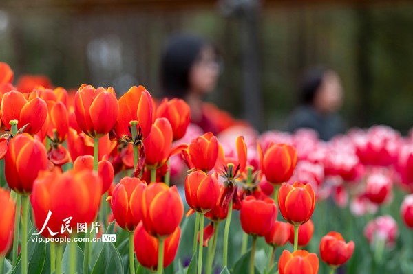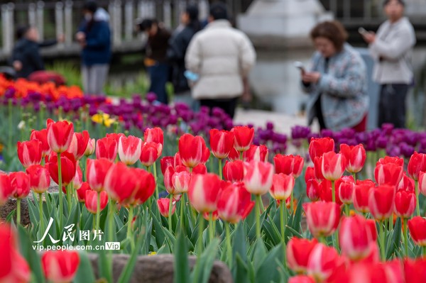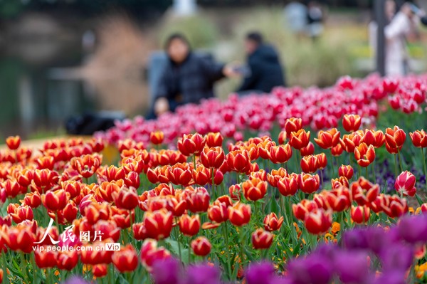 连日来,浙江金华燕尾洲公园内,成片郁金香相继绽放。五彩缤纷的花朵娇艳动人,吸引众多市民和游客前来观赏。胡肖飞摄(人民图片网)