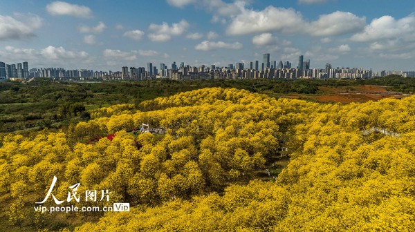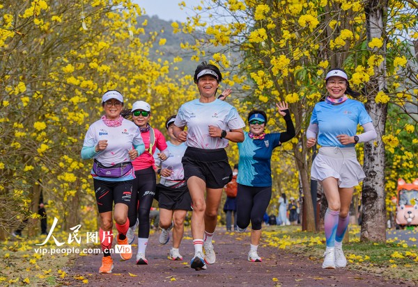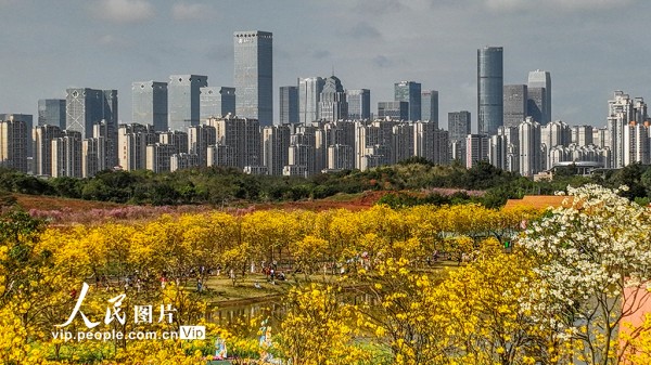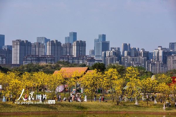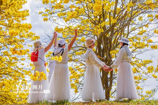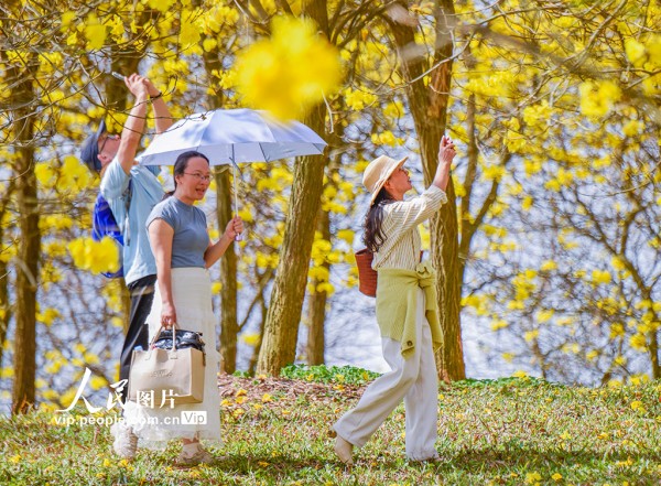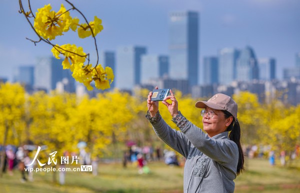 2026年3月1日,广西南宁青秀山风景区黄花风铃木盛开,吸引众多市民前来休闲赏花、拍照打卡。彭寰摄(人民图片网)