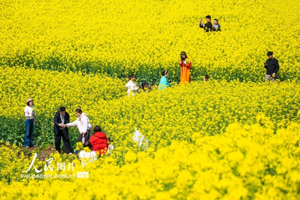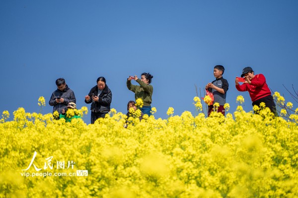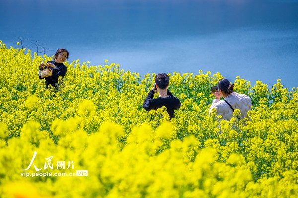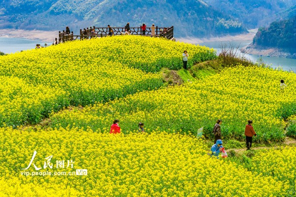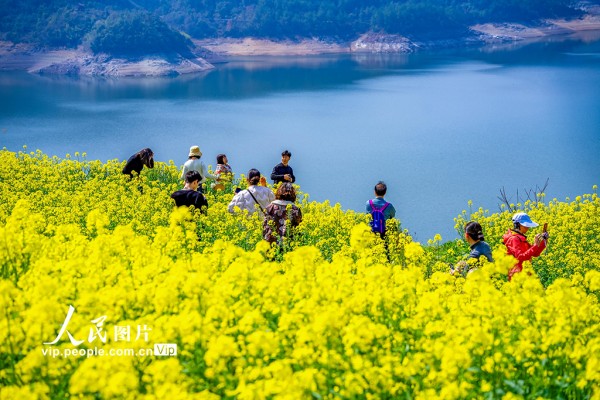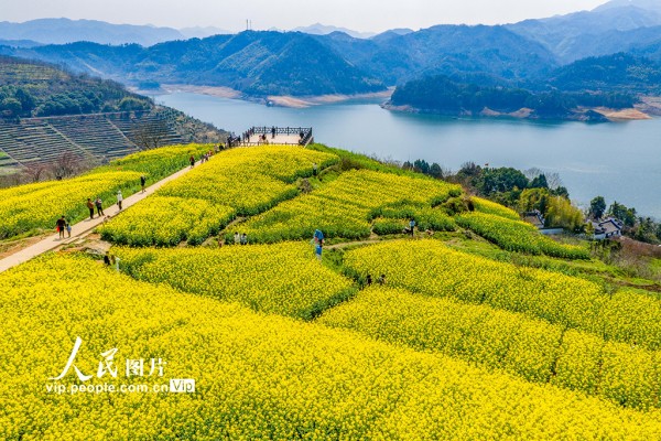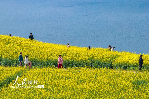 2026年3月7日,浙江省绍兴市新昌县沃洲湖,油菜花相继绽放,吸引游客前来踏春赏花。潘伟峰摄(人民图片网)