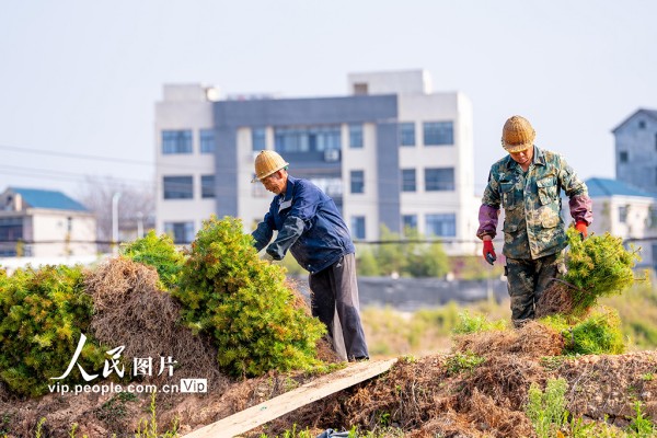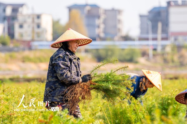 2026年3月17日,在福建松溪国有林场的苗木基地,工人与机械协同配合,有序进行起苗、分拣、捆扎等作业,现场一派繁忙。王德锋摄(人民图片网)