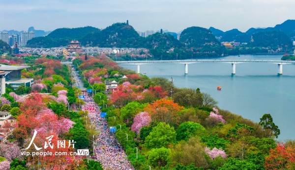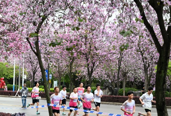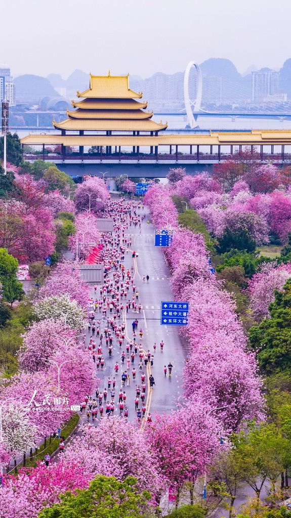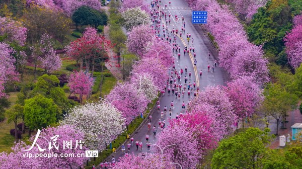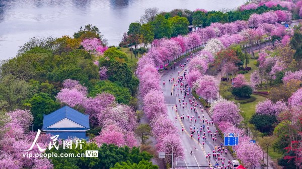 连日来,广西柳州30万株洋紫荆次第盛放,粉白花海铺满大街小巷,柳江碧水与两岸繁花相映,整座城市宛如一幅春日长卷。据了解,这是柳州首次举办全民跑活动,以更亲民、更开放、更友好的参与方式,让不同目标的人群走上了这条开满繁花的经典赛道,受到众多跑友的喜爱。黎寒池摄(人民图片网)