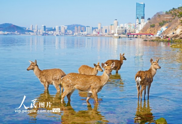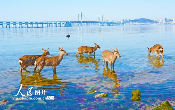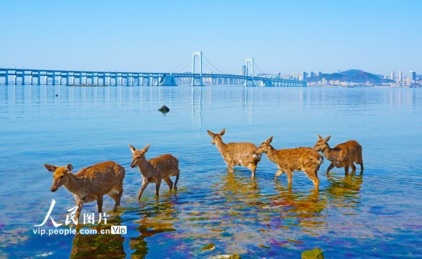 近年来,随着辽宁大连莲花山的梅花鹿种群不断繁衍扩大,傅家庄、金沙滩、银沙滩等海域也成了鹿群经常光顾的地方。吕文正摄(人民图片网)