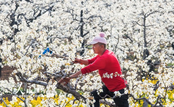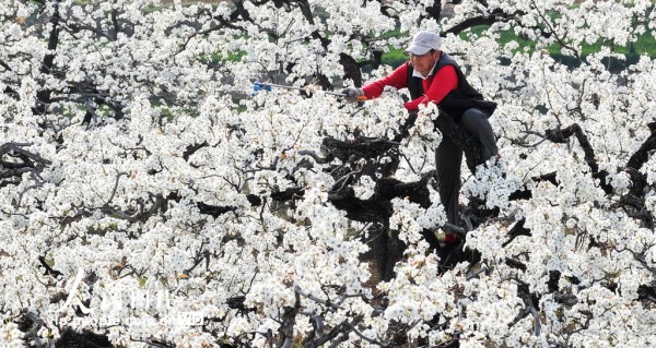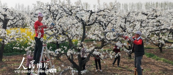 2026年3月29日,山东省枣庄市刘村的梨花竞相开放,果农忙着对梨花进行人工授粉。洪晓东摄(人民图片网)