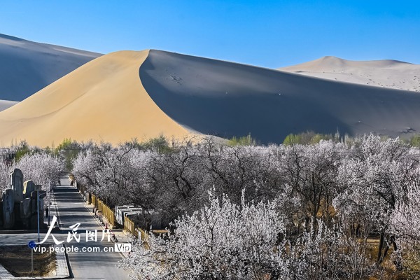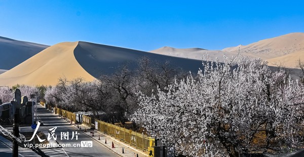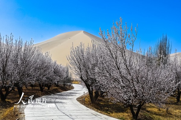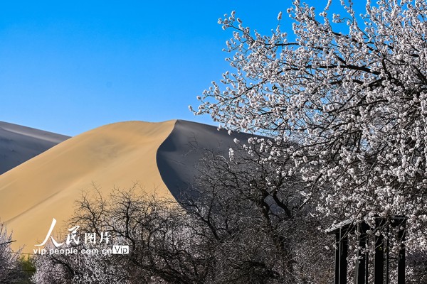 2026年3月31日,甘肃敦煌鸣沙山下,杏花次第绽放。王斌银摄(人民图片网)