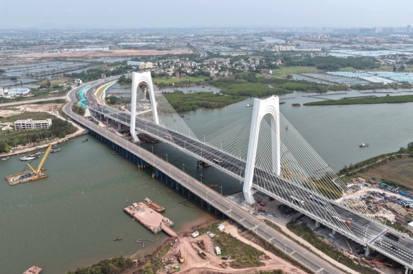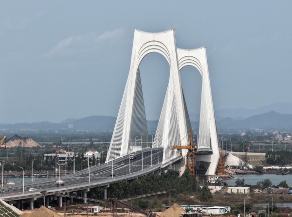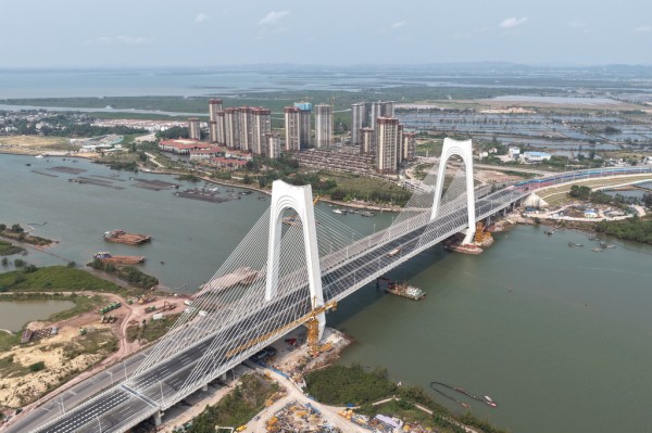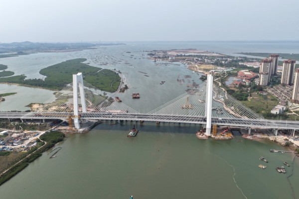 3月31日,地处钦江入海口的平陆运河沙井钦江大桥建成通车。至此,平陆运河规划的27座跨线桥梁中,已有25座桥梁建成通车,全线桥梁工程即将收官。新华社记者 周华 摄