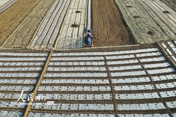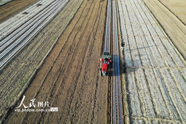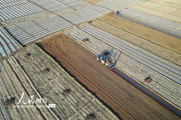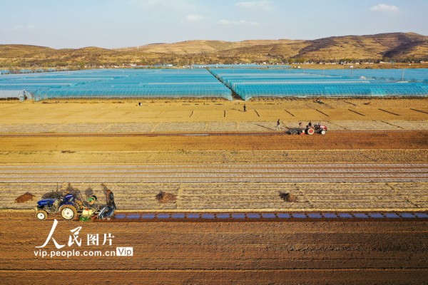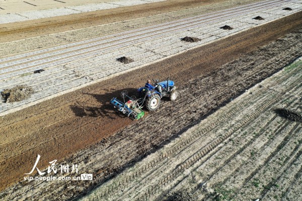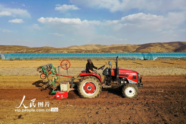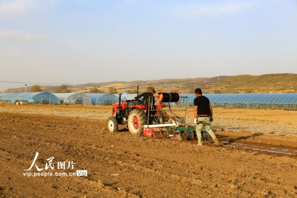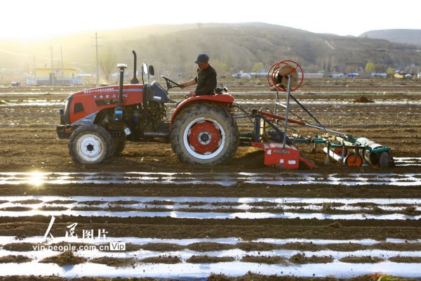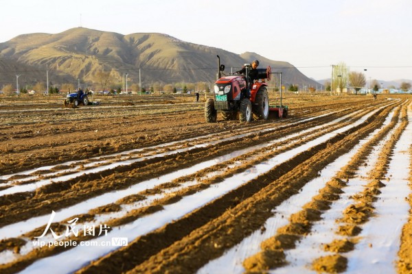 2026年4月4日,宁夏回族自治区固原市西吉县将台堡镇西坪村玉米种植基地里,农民抢抓农时组织旋耕覆膜保墒作业,为玉米春播做足准备。马玉福摄(人民图片网)