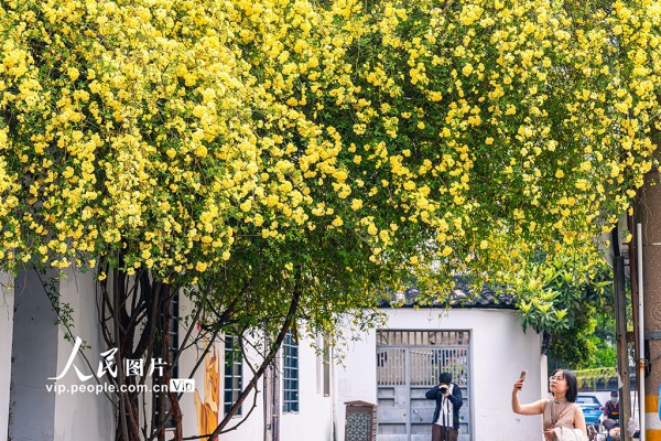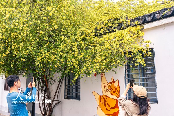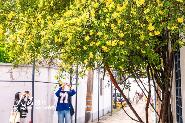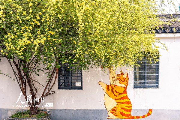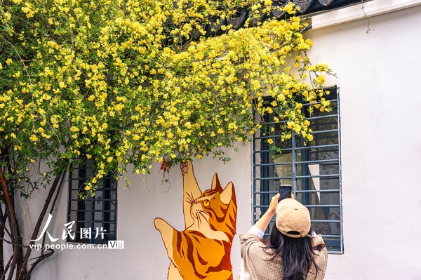 2026年4月6日,江苏苏州阔家头巷,黄色的木香花与墙绘相映成趣。张锋摄(人民图片网)