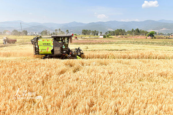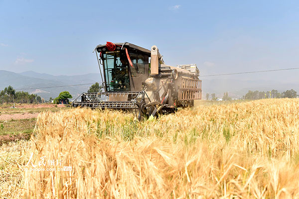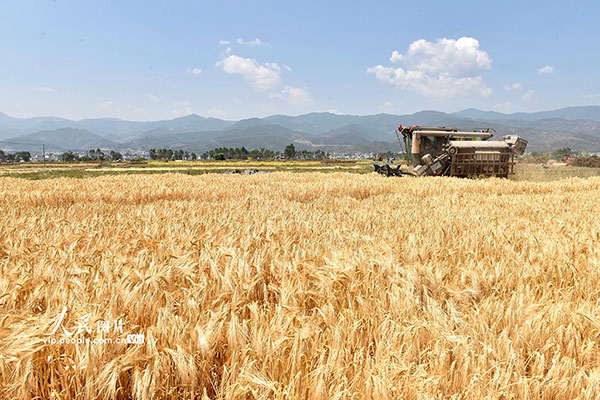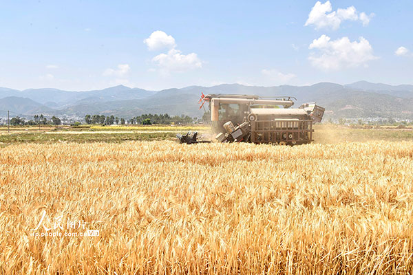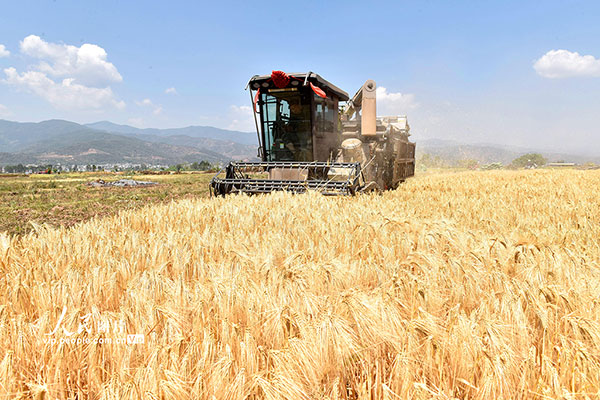 近日,云南大理巍山彝族回族自治县5.64万亩大麦开镰收割。农民抢抓晴好天气,使用收割机等农机抢收,确保颗粒归仓,田间地头一派繁忙丰收景象。张树禄摄(人民图片网)