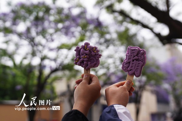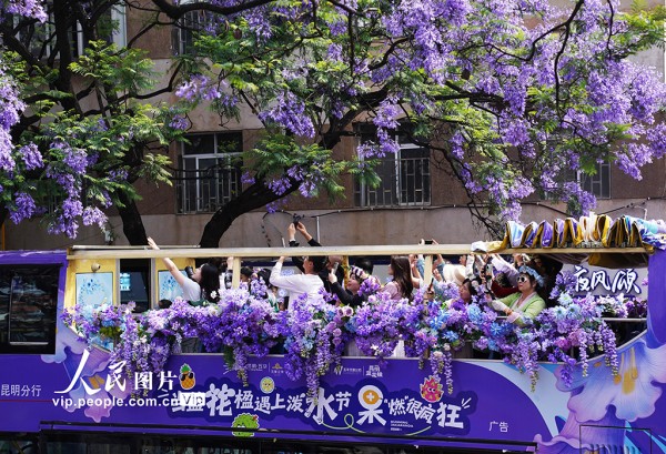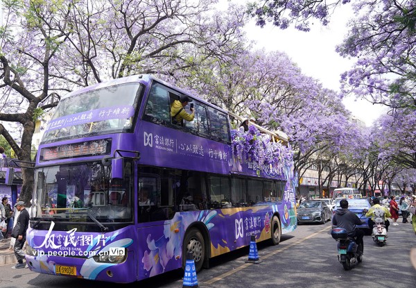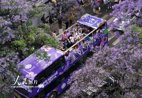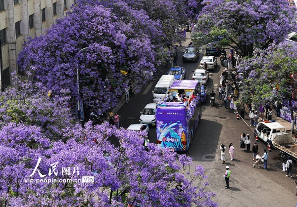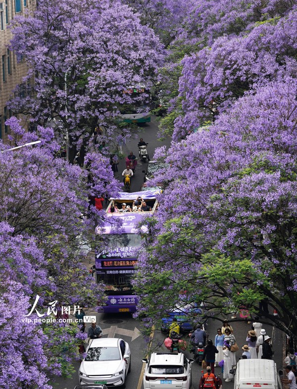 连日来,云南昆明教场中路的蓝花楹竞相绽放,吸引众多市民游客前来打卡,共赴这场紫色花海之约。梁志强摄(人民图片网)