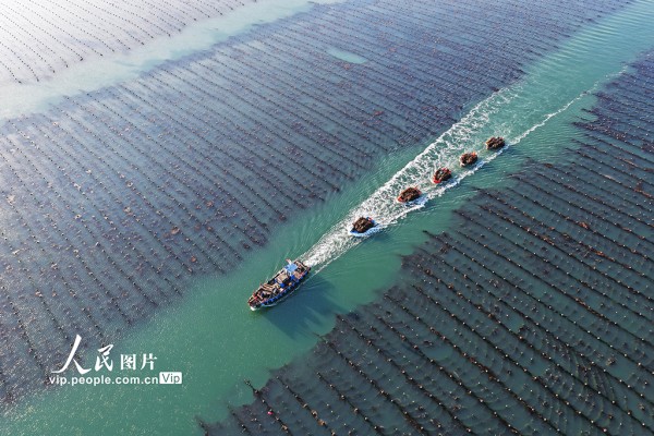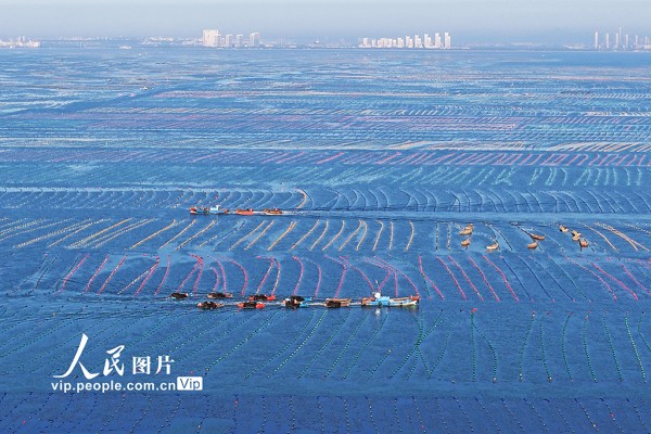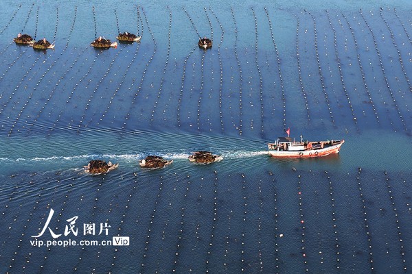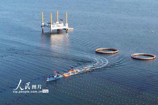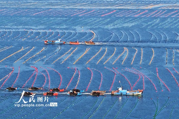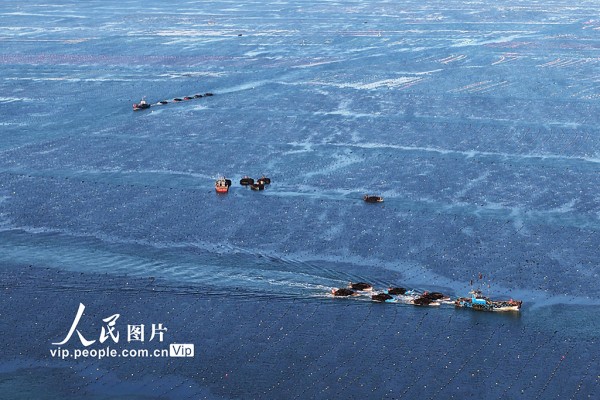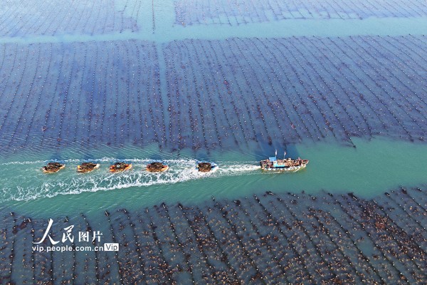 2026年4月26日,山东荣成市18万亩海带进入集中收获期。各大海洋牧场海带养殖区内,养殖工人正驾驶作业船只抢收海带,运载船只往来穿梭,呈现出一派繁忙的海上采收景象。张世松摄(人民图片网)