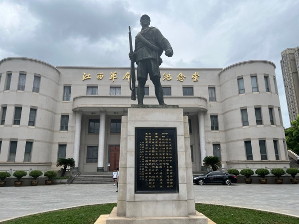 走出展厅,一眼看见展馆外的广场上,矗立着一尊手持钢枪、目视远方的古铜色战士雕像,与其身后镶有“江西省革命烈士纪念堂”金色大字融为一体,仿佛告诉历史与未来,红土地上的革命烈士形象,永远屹立不倒!