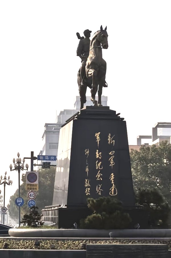 走出泰山庙旧址,沿着建军西路一路向东,便来到“大铜马”雕塑广场。这个广场位于盐城市中心解放路和建军路两条交通干道交会结合处,是盐城市公路的零公里起点。它是建军路上一条直线三个点的中心点,更像个“扁担人”,西头挑着泰山庙,东头牵着新四军纪念馆。其正式名称为“新四军重建军部纪念塔”,“大铜马”是老百姓的习惯叫法。该塔总高10.12米,青铜雕塑部分高4米、长3.8米、重3250公斤。主体为青铜铸造的新四军骑马战士雕塑。远远望去,其形象为一位年轻英武、身背大刀的新四军战士,跨上奔腾的骏马,手握战马的缰绳,正在策马飞跃前进,象征着新四军东进盐城、奋力开辟华中敌后抗日根据地的信心和决心。整座雕塑由时任全国城市雕塑规划小组副组长、中央美术学院雕塑系主任王克庆教授创作设计,塔基上刻有原新四军第四师师长张爱萍将军亲笔题词,塔名由书法家鲍审手书。“大铜马”现已成为盐城市最显著的城市地标与精神象征物。