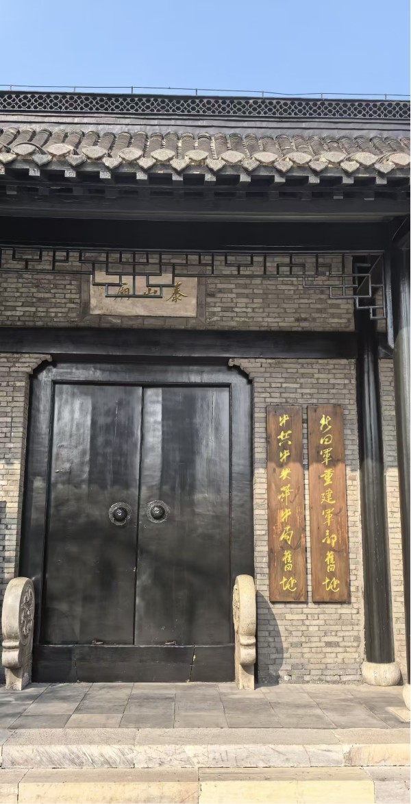 泰山庙位于江苏省盐城市亭湖区建军西路118号,毗邻盐城市博物馆。我记不清多少次带着崇敬的情感,参观瞻仰过这座红色遗址。2026年1月16日,当我再次伫立在此,那扇黑色大门上方一块小小的石匾上,由赵朴初题写的3个金色大字“泰山庙”显得格外突出。大门右侧悬挂着2块暗红色的木牌,上面分别书写着“新四军重建军部旧址”和“中共中央华中局旧址”金色行书体大字。两个“旧址”的分量很重,承载着一段光荣的历史,不断地吸引人们去品读和考证。