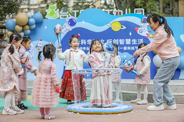 12月30日,福建省福州市台江区滨江幼儿园内,一场以“传承科学薪火 玩创智慧生活”为主题的首届科技节正在举办,吸引约300组家庭热情参与。AR机器人、梦幻泡泡秀和红色文化、迎新活动等内容深度融合,让孩子们在趣味互动中感受新年喜悦。