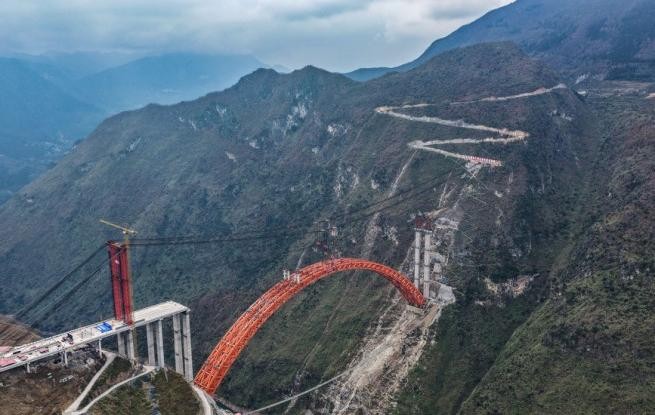 1月5日,随着最后一节钢拱精准吊装到位,贵州交投集团承建的安顺至盘州高速公路古牛河特大桥顺利合龙,为后续工程建设推进奠定了坚实基础。古牛河特大桥是安盘高速控制性工程,全长881.8米,主桥横跨古牛河,主桥桥面到谷底高度约400米。
