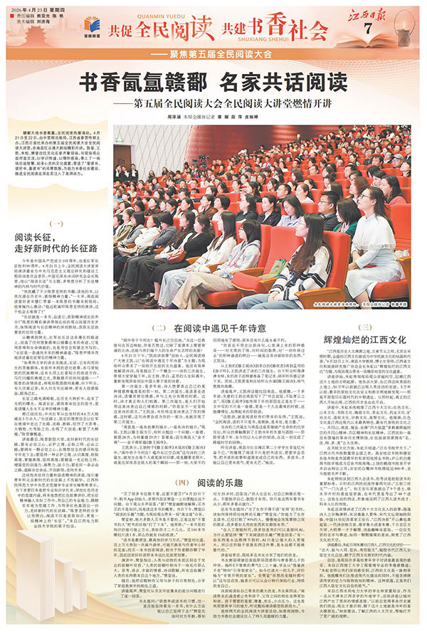 赣鄱大地书香氤氲,全民阅读热潮涌动。4月21日至22日,由中宣部出版局、江西省委宣传部主办,江西日报社承办的第五届全民阅读大会全民阅读大讲堂,在南昌红谷滩大剧场精彩开讲。