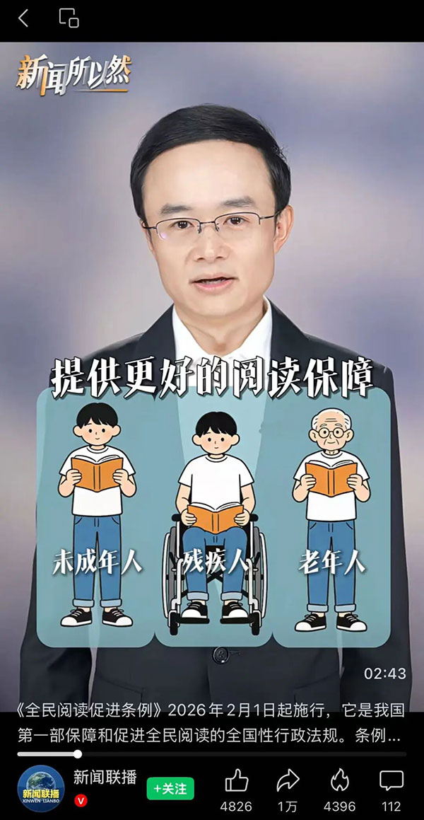 为深入推进全民阅读、建设社会主义文化强国,党的十八大以来,“全民阅读”连续写入政府工作报告,党的二十大进一步提出“深化全民阅读活动”。在此背景下,国务院制定并公布的《全民阅读促进条例》,将于2026年2月1日起施行。